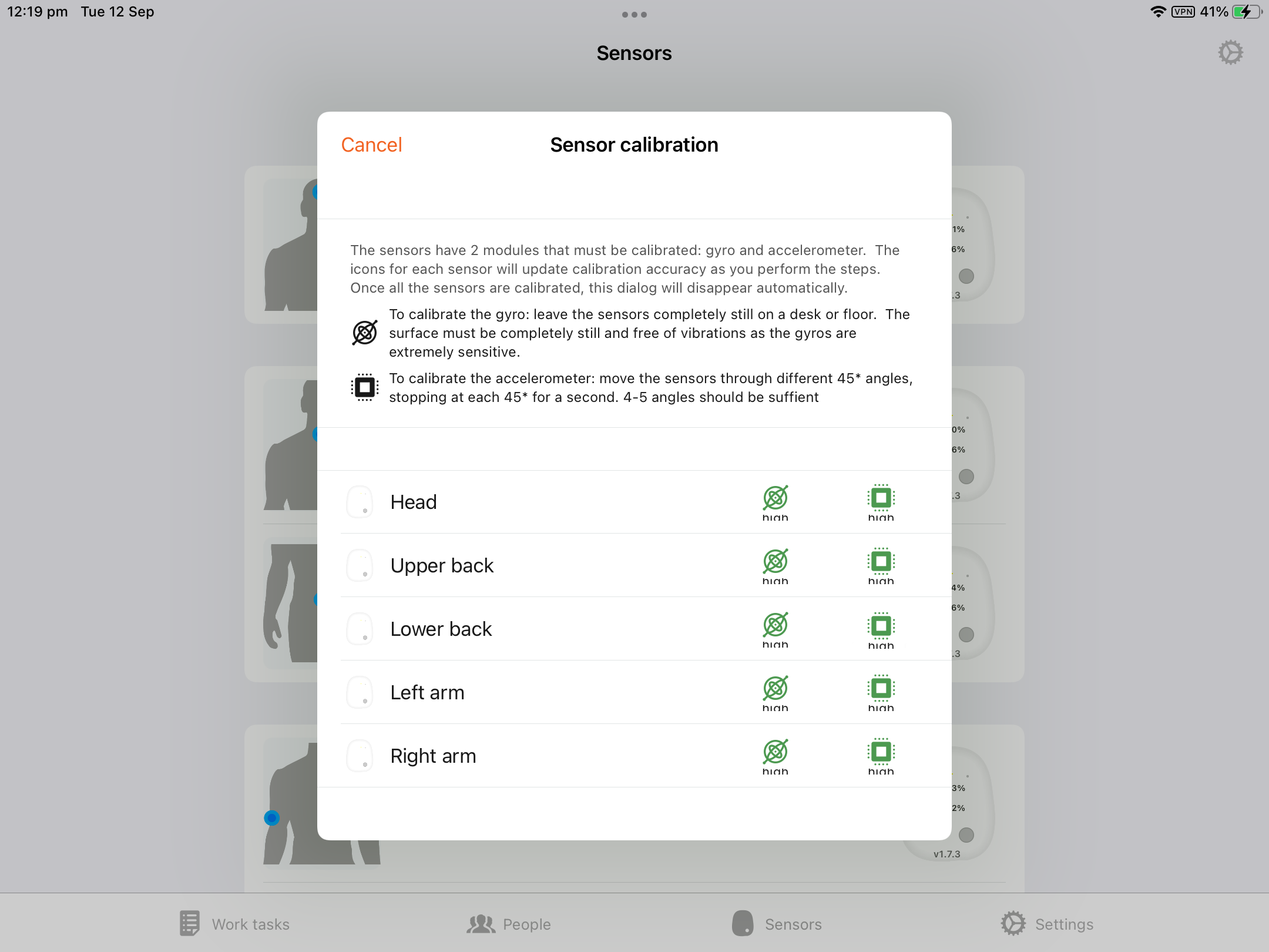Place the sensors on a flat surface for several seconds until the app calibrates each of the gyros.